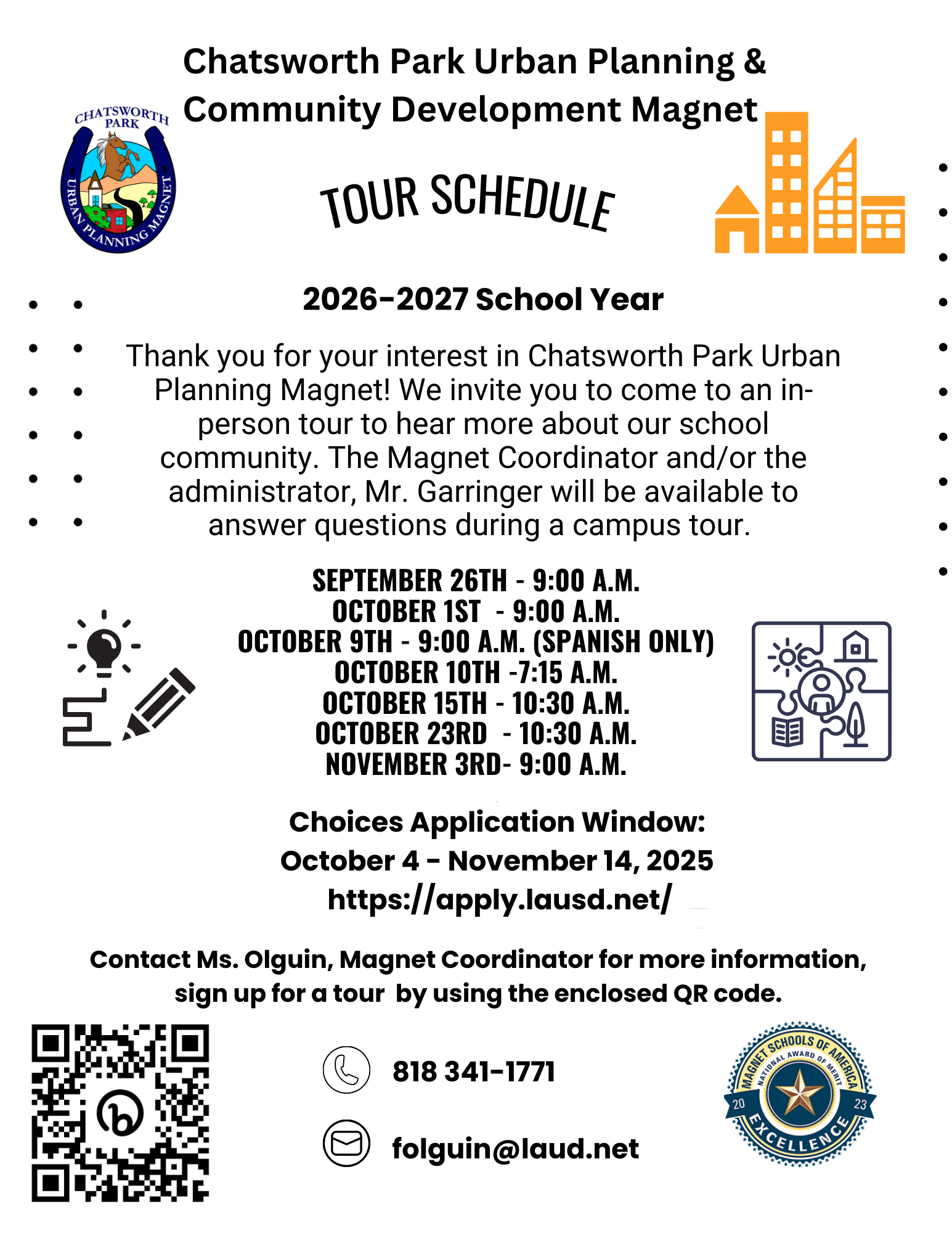We invite you to come to an in-person tour to hear more about our campus, teachers, and programs. To apply to our school, visit: Apply LAUSD